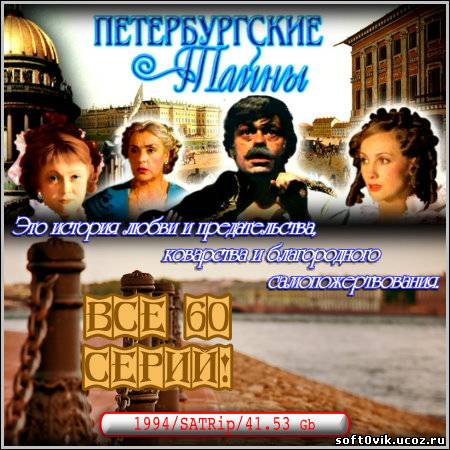 Название: Петербургские тайны - Все 60 серий Год выхода: 1994 Жанр: Драма, История Режиссер: Вадим Зобин, Леонид Пчелкин В ролях: Елена Яковлева, Наталья Гундарева, Виктор Раков, Николай Караченцов, Лидия Федосеева-Шукшина, Евгения Крюкова, Валерий Баринов, Дмитрий Брусникин, Сергей Чонишвили, Виктор Авилов, Федор Стуков, Ирина Розанова, Владимир Стеклов, Игорь Ясулович,